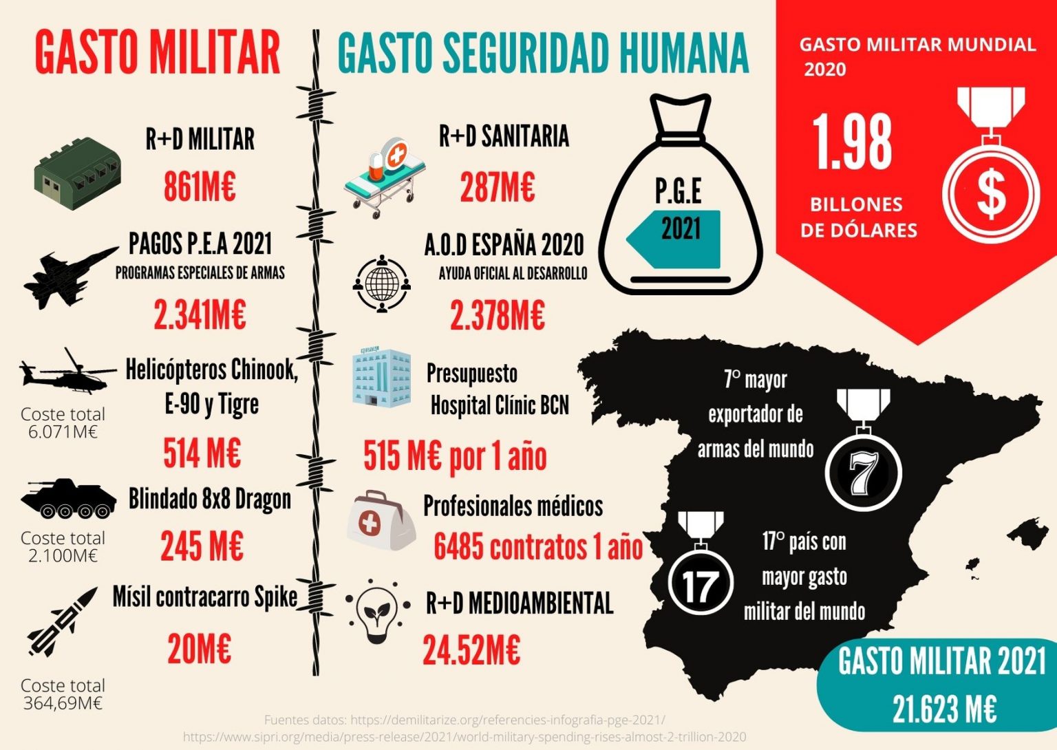 Levamos anos asistindo, antes da guerra de Ucraína ou do xenocidio en Gaza, a un gran aumento do gasto militar e do diñeiro destinado á adquisición de armas. E como xa sabemos, á hora de elaborar os orzamentos xerais do Estado, o que se dedica a unha área, vai en detrimento doutra; o que se gasta en armamento e gasto militar, prexudica ao destinado a mellorar a calidade de vida da poboación, como a saúde, educación, vivenda, servizos sociais, loita contra a crise climática, desigualdade de xénero ou cultura.